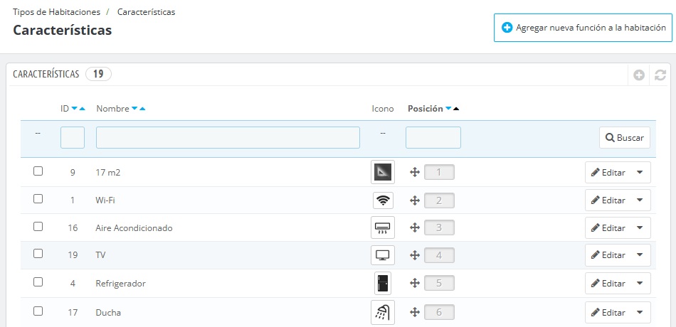 - Logotipo de la característica de la habitación : En este campo debe seleccionar el icono que representa a la característica.
