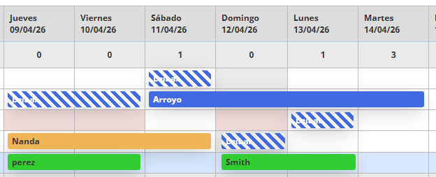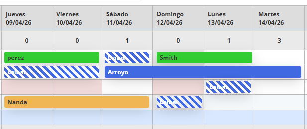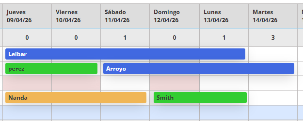 - modificar fecha de inicio. Al pasar el ratón encima de la reserva, el puntero del ratón cambia a un icono de 2 direcciones, izquierda y derecha. Pulsar el botón izquierdo del ratón y desplazar la reserva a la izquierda o derecha según interese.
