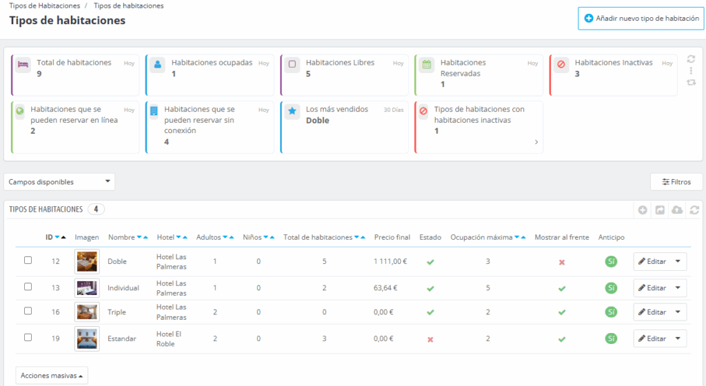 En esta página, puede gestionar los tipos de habitaciones editando los existentes o creando otros nuevos.